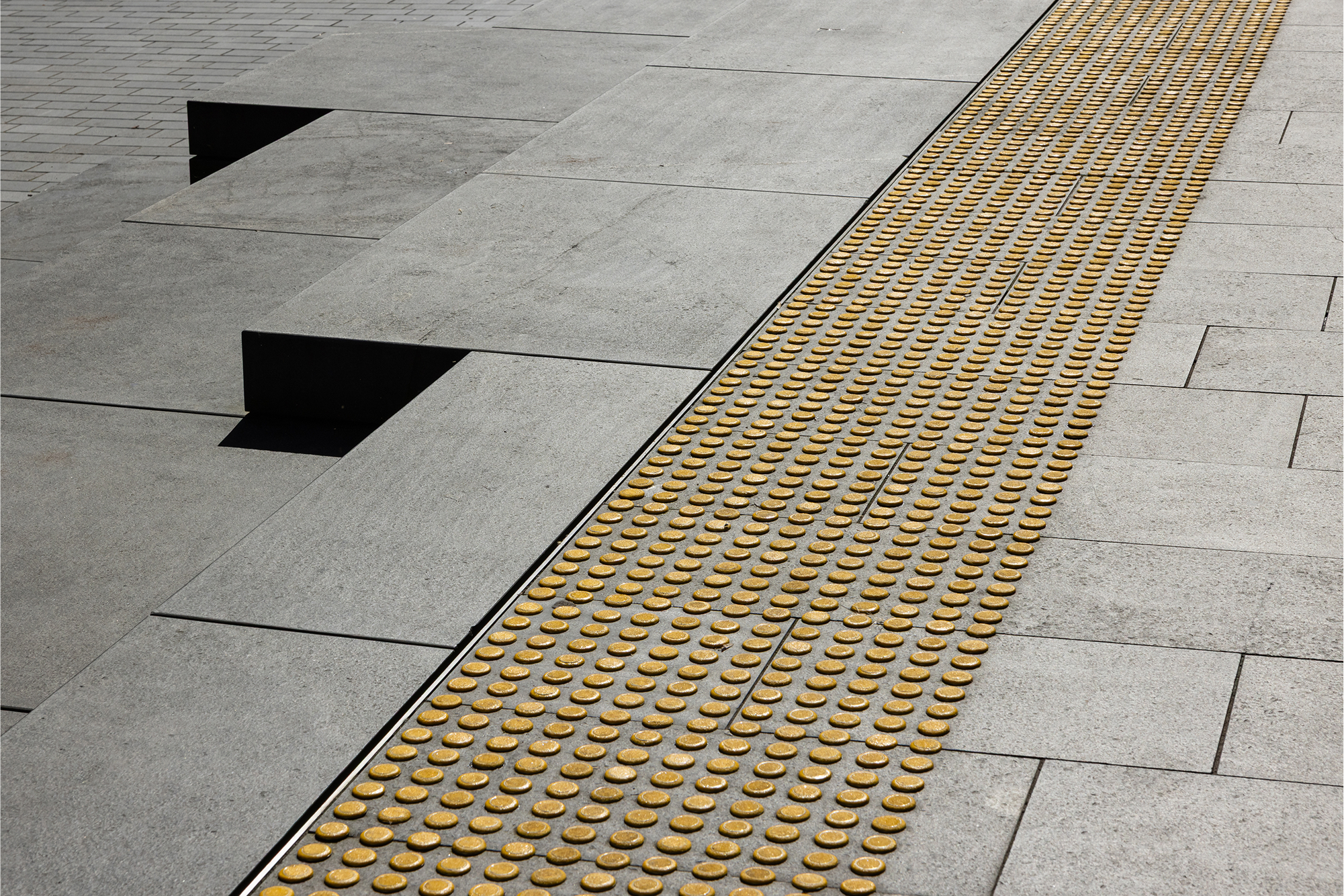 We know that when tactile indicators aren't carefully designed, they're likely to break down and create a risk of accidents. After assessing the needs of the library environment, we switched from our standard 6mm indicator stems to a thicker 8mm stem to make sure our installation was as secure as possible. These studs also allowed our team to accommodate an access hatch in the streetscape, something that would not have been possible with paver-style indicators.