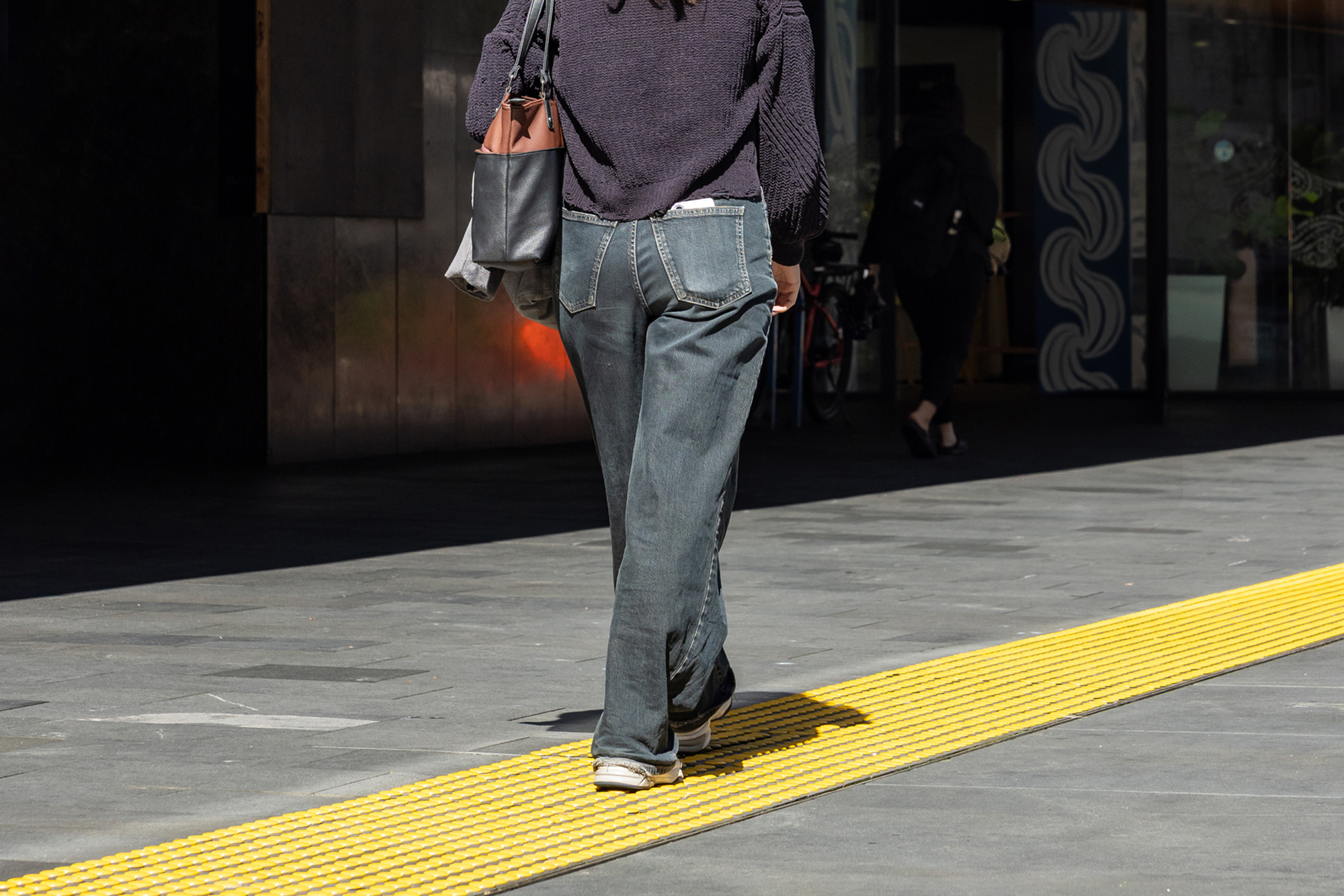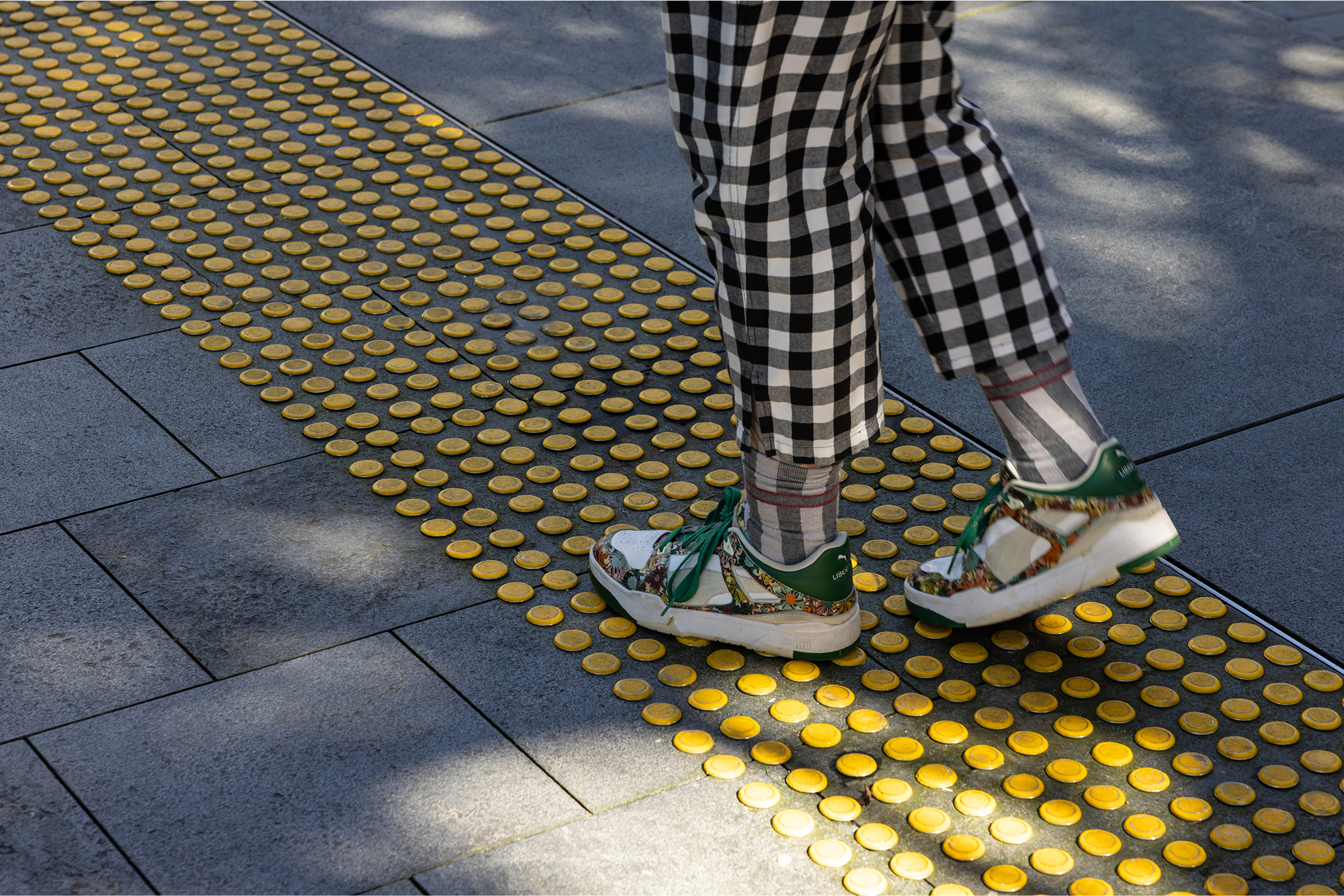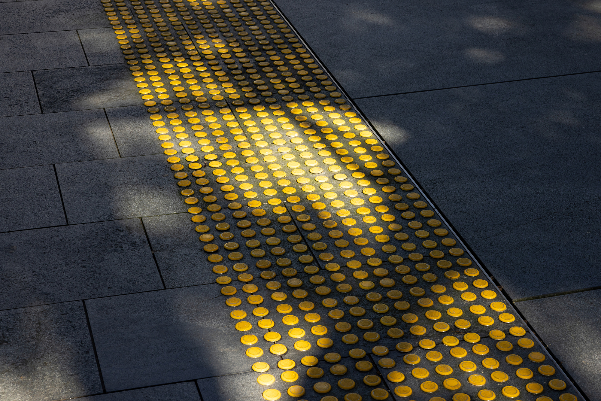 It was hard work, but well worth it: this shining ribbon of yellow tactile indicators will keep pedestrians safe around the beloved library.